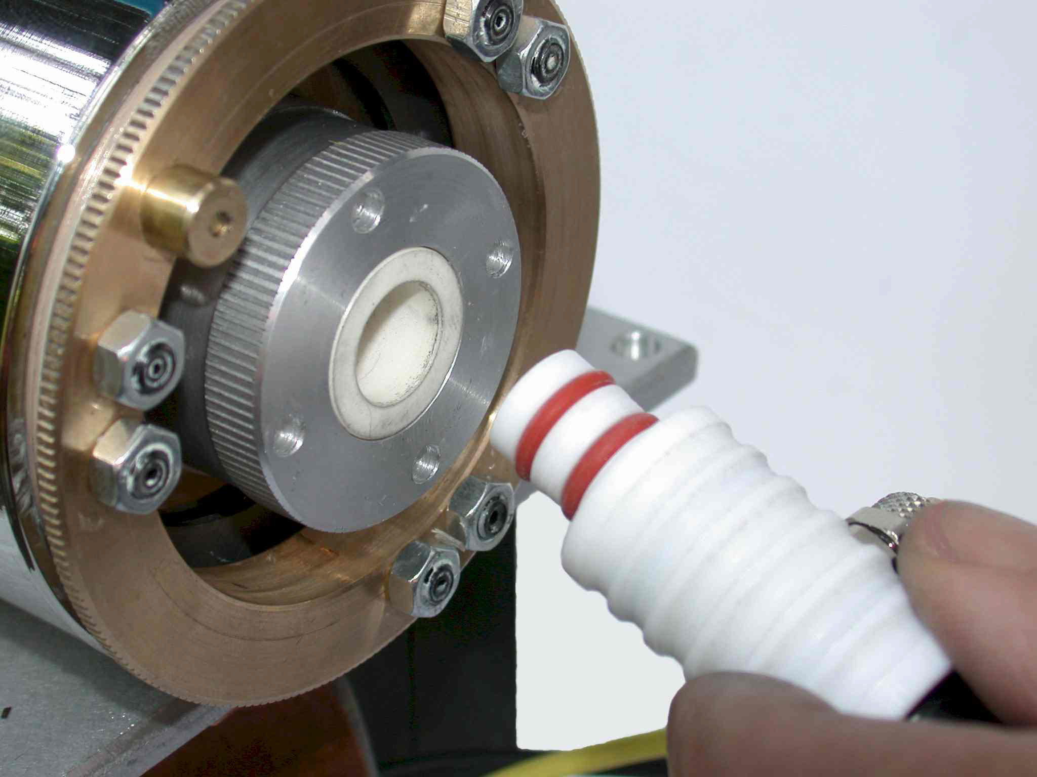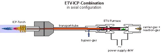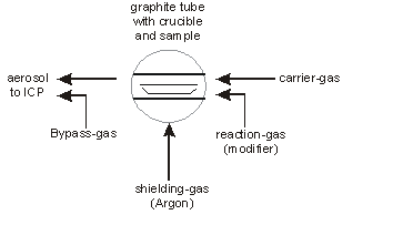 At the end of the graphite tube an additional Argon-stream (bypass-gas) is being added in a patented way. In this most important area of some millimeters length only the transformation of the halogenised vapour into a dry and saturated aerosol is being performed. At the same time the cooler walls outside the heated graphite tube are being protected by the bypass gas against condensation-effects - that otherwise would create disturbing memory effects. This kind of gas treatment achieves extremely high transport efficiencies for the rest of the transport way towards the ICP-plasma. The sample vapour is being led directly into the plasma by a PTFE- or ceramic-tube.